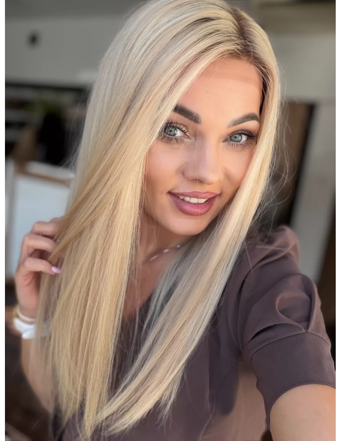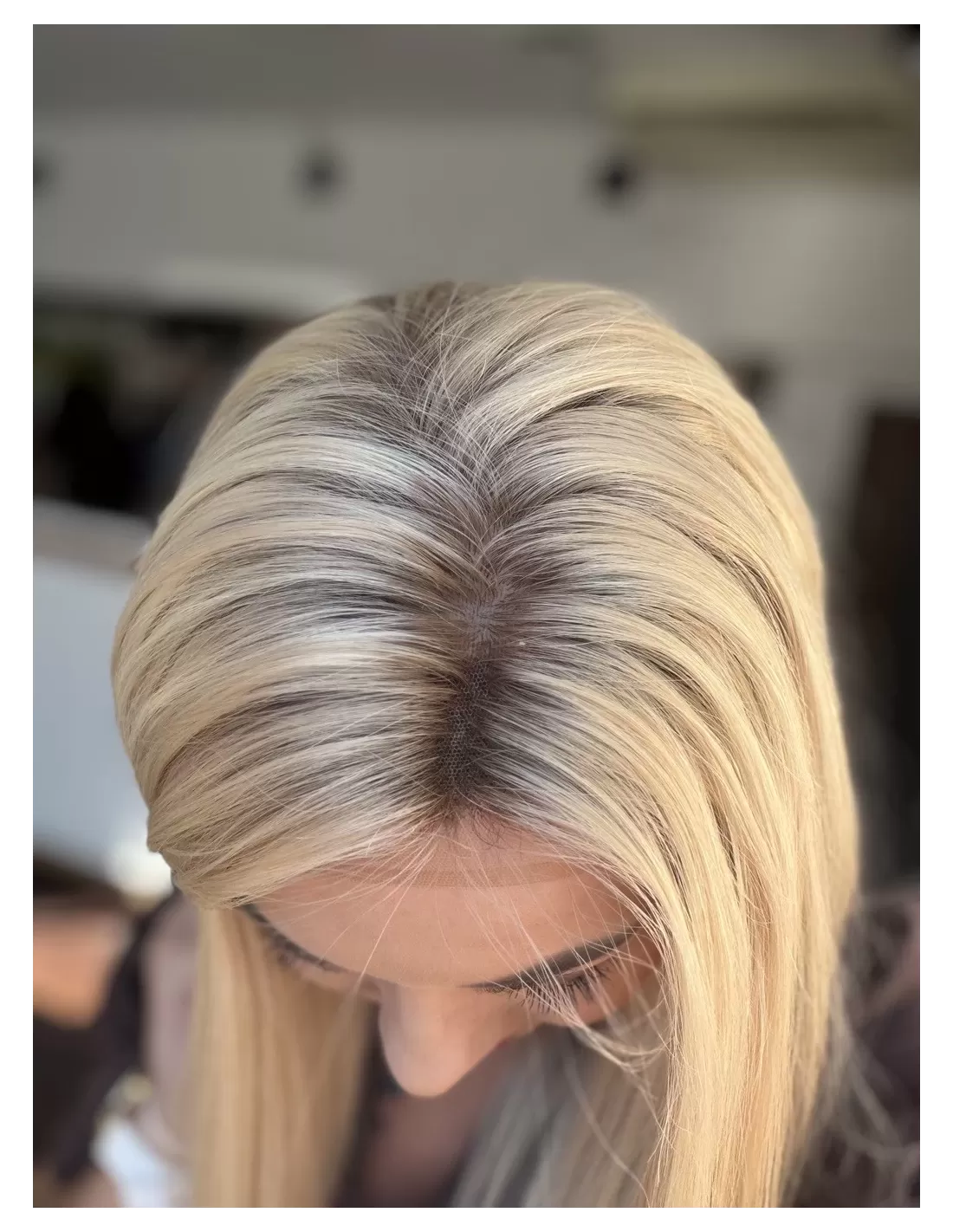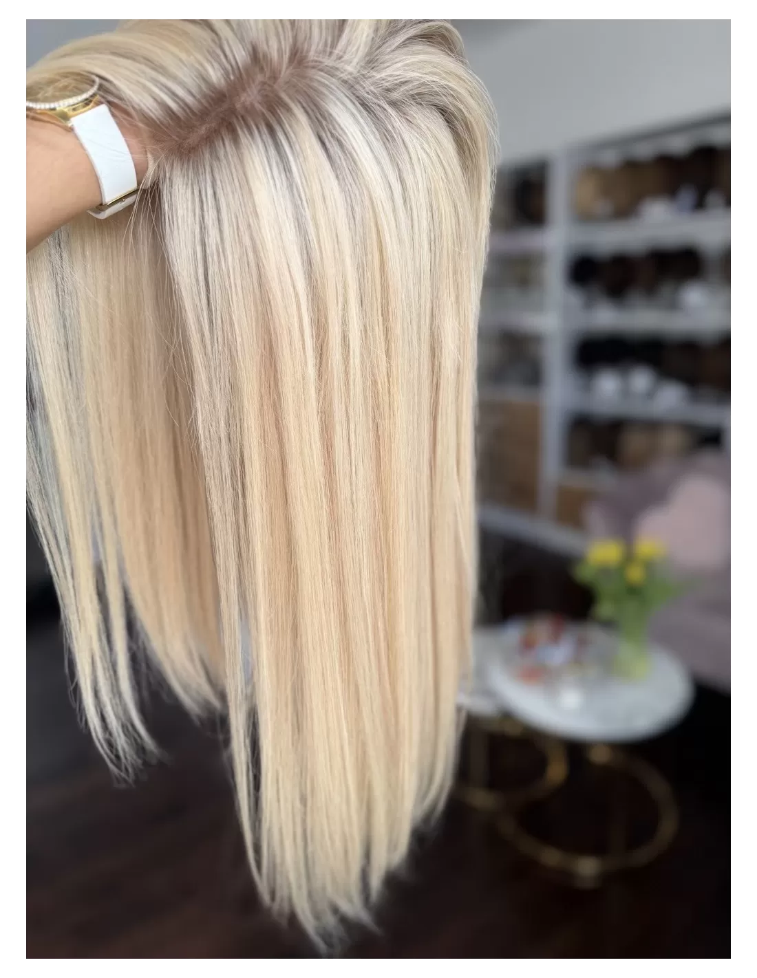 Jasny, świetlisty blond w neutralno-ciepłej tonacji, o bardzo eleganckim i delikatnym charakterze. U nasady widoczny jest subtelnie przyciemniony odcień jasnego beżu / bardzo jasnego blondu, który płynnie przechodzi w długościach w miękką mieszankę waniliowych, kremowych i piaskowych tonów. Całość tworzy harmonijny, jednolity efekt luksusowego, rozświetlonego blondu bez ostrych kontrastów. Kolor pięknie odbija światło i nadaje twarzy świeżości.