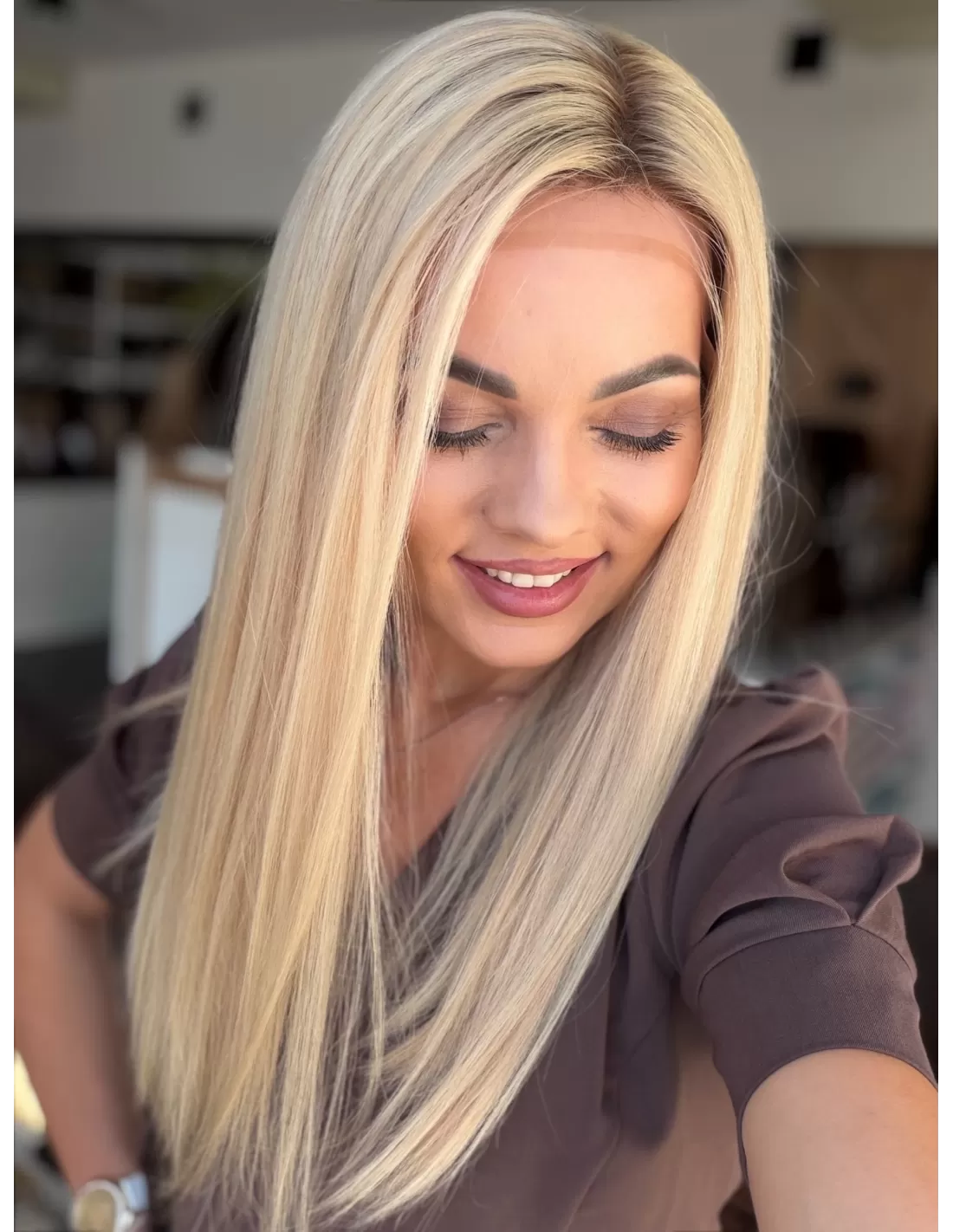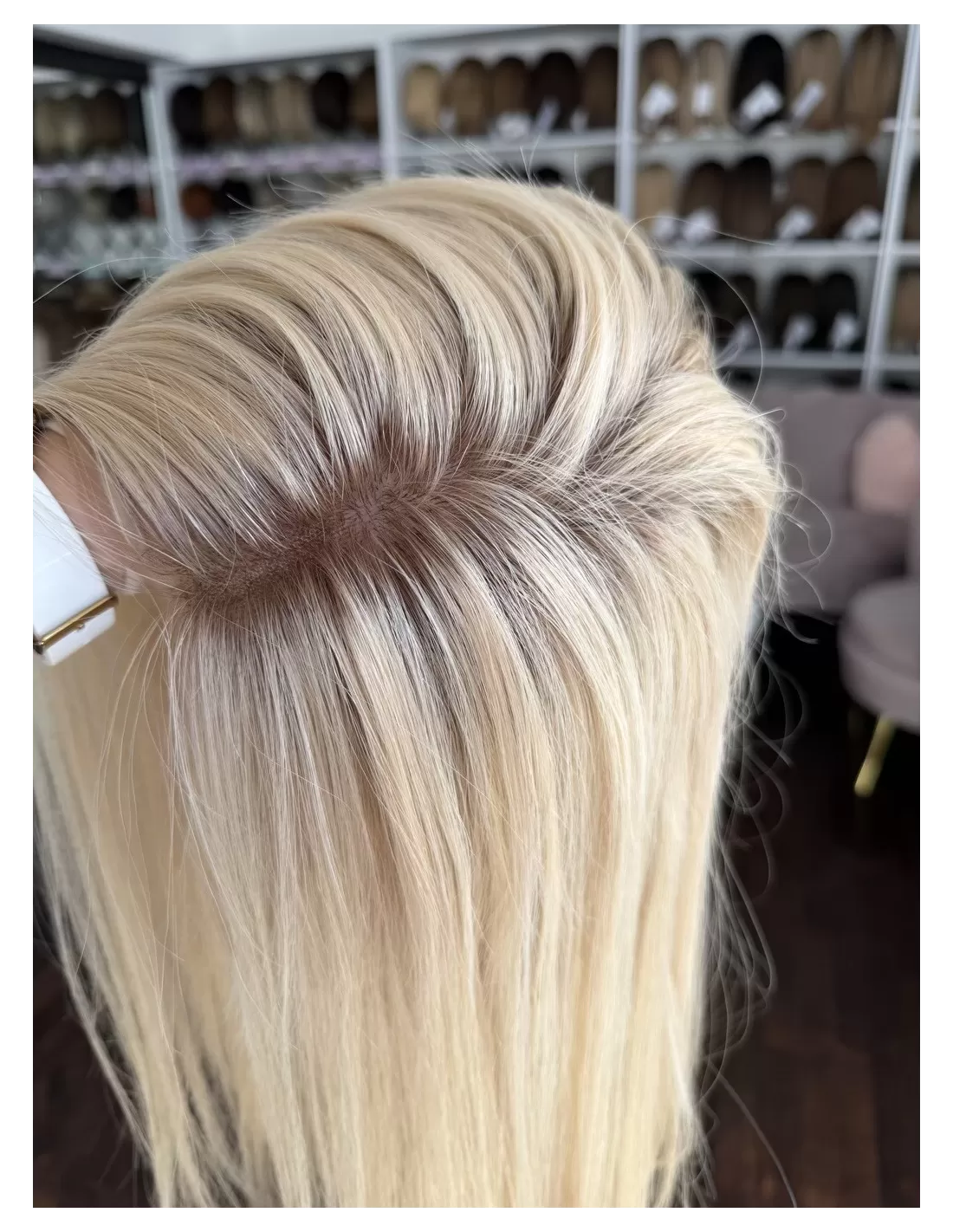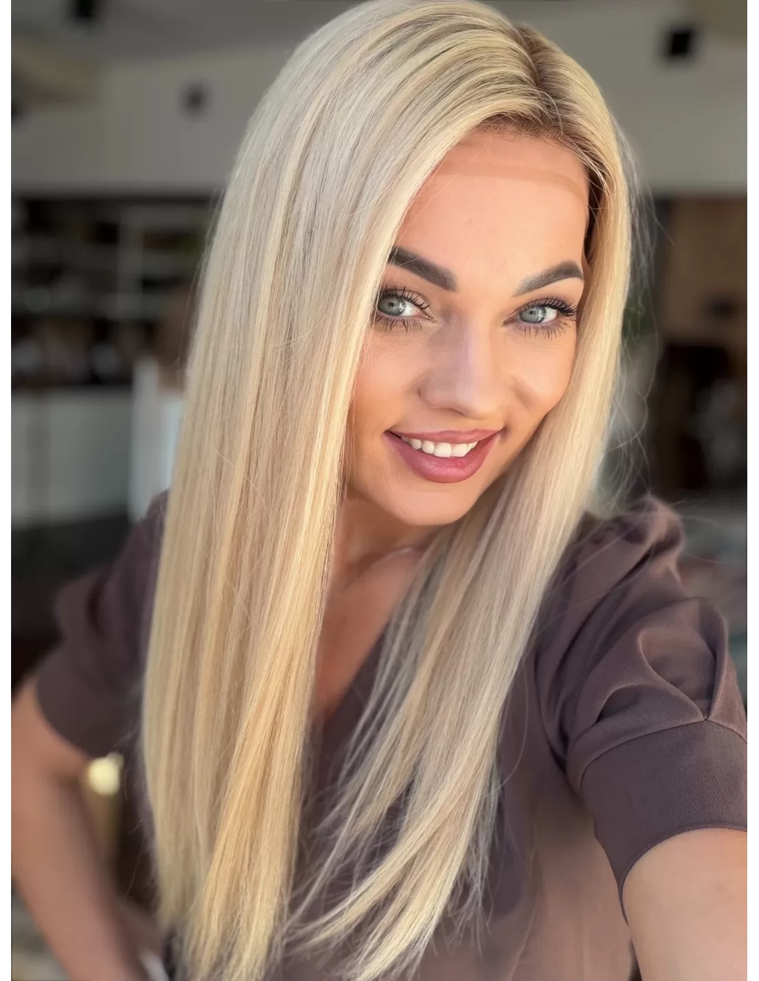 Jasny, świetlisty blond w neutralno-ciepłej tonacji, o bardzo eleganckim i delikatnym charakterze. U nasady widoczny jest subtelnie przyciemniony odcień jasnego beżu / bardzo jasnego blondu, który płynnie przechodzi w długościach w miękką mieszankę waniliowych, kremowych i piaskowych tonów. Całość tworzy harmonijny, jednolity efekt luksusowego, rozświetlonego blondu bez ostrych kontrastów. Kolor pięknie odbija światło i nadaje twarzy świeżości.