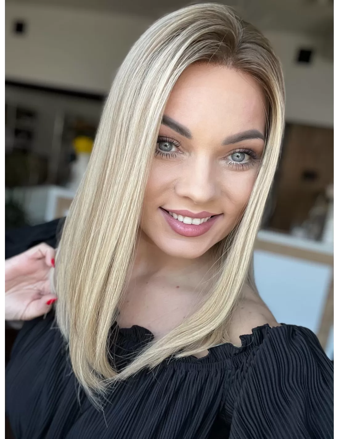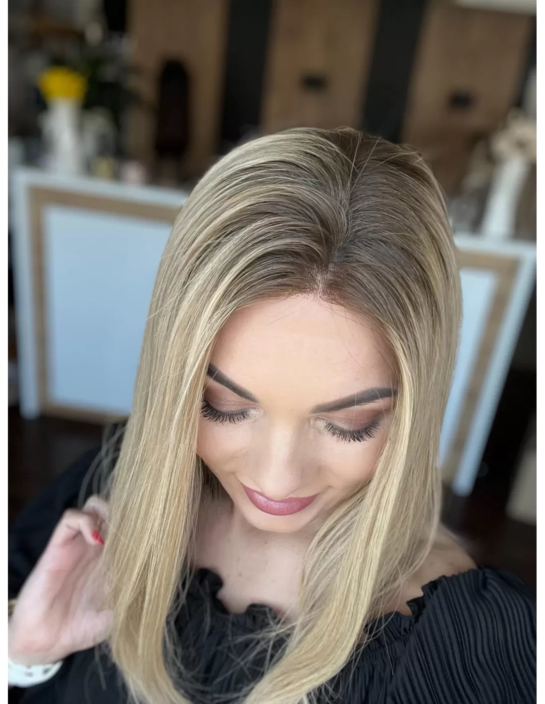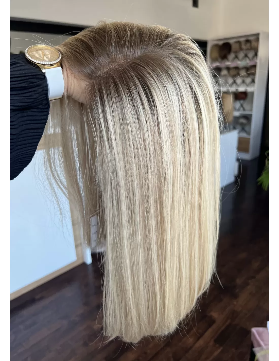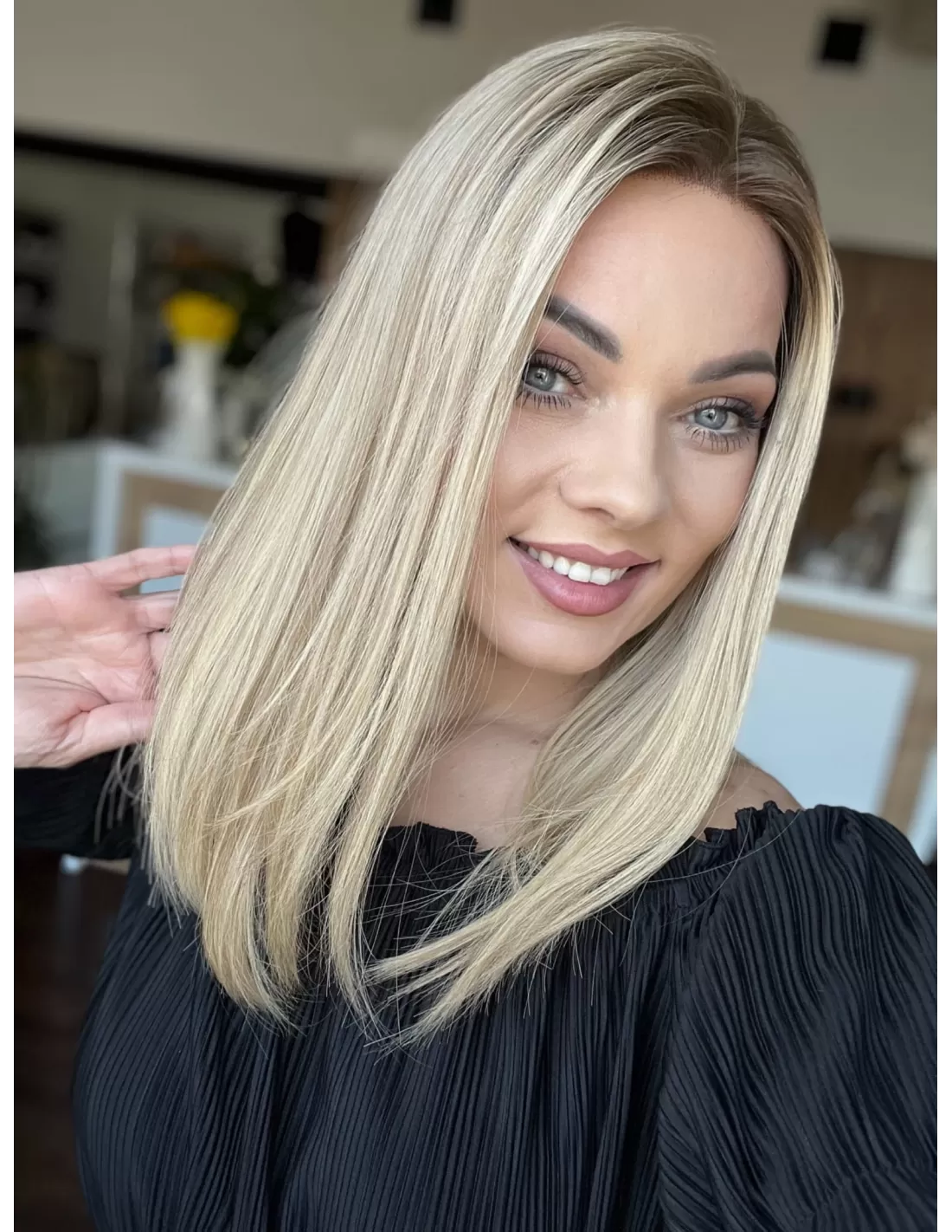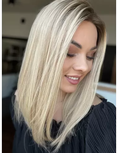 Ta wyjątkowa peruka z włosów naturalnych zachwyca perfekcyjnie dobranym stonowanym chłodnym odcieniu blondu. Delikatny odrost w odcieniu jasnego chłodnego brązu subtelnie podkreśla naturalność koloru, dodając mu autentycznego charakteru.