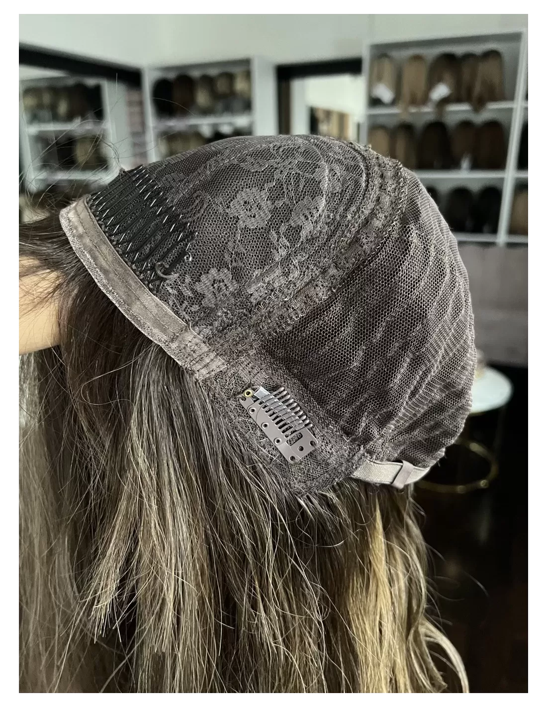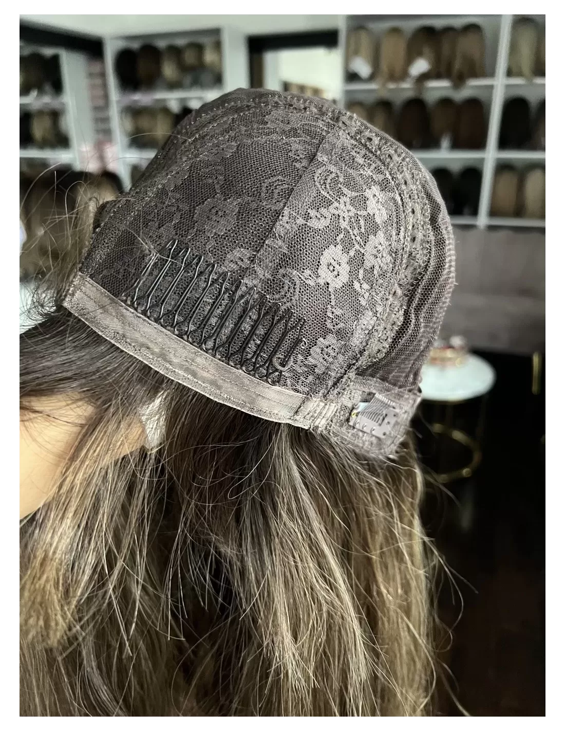 Model został osadzony na elastycznym czepku, który komfortowo dopasowuje się do kształtu głowy. W centralnej części czepka znajduje się wkładka z mikroskóry, wiernie imitująca naturalną skórę głowy w przedziałku, co znacząco podnosi realizm fryzury i estetykę noszenia.