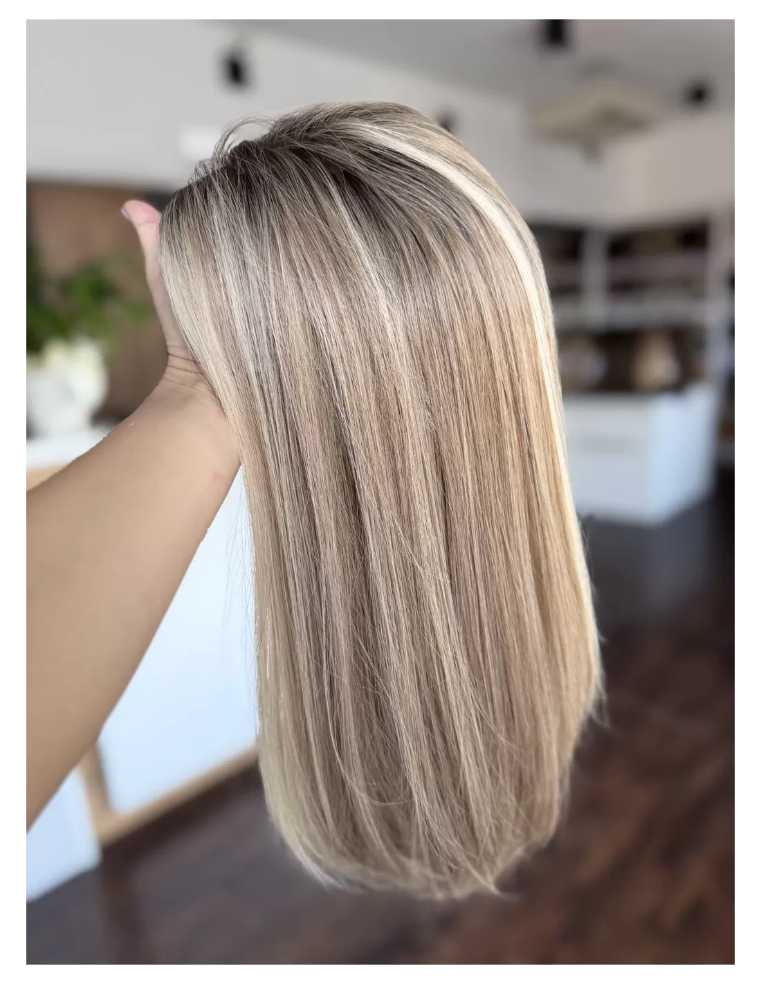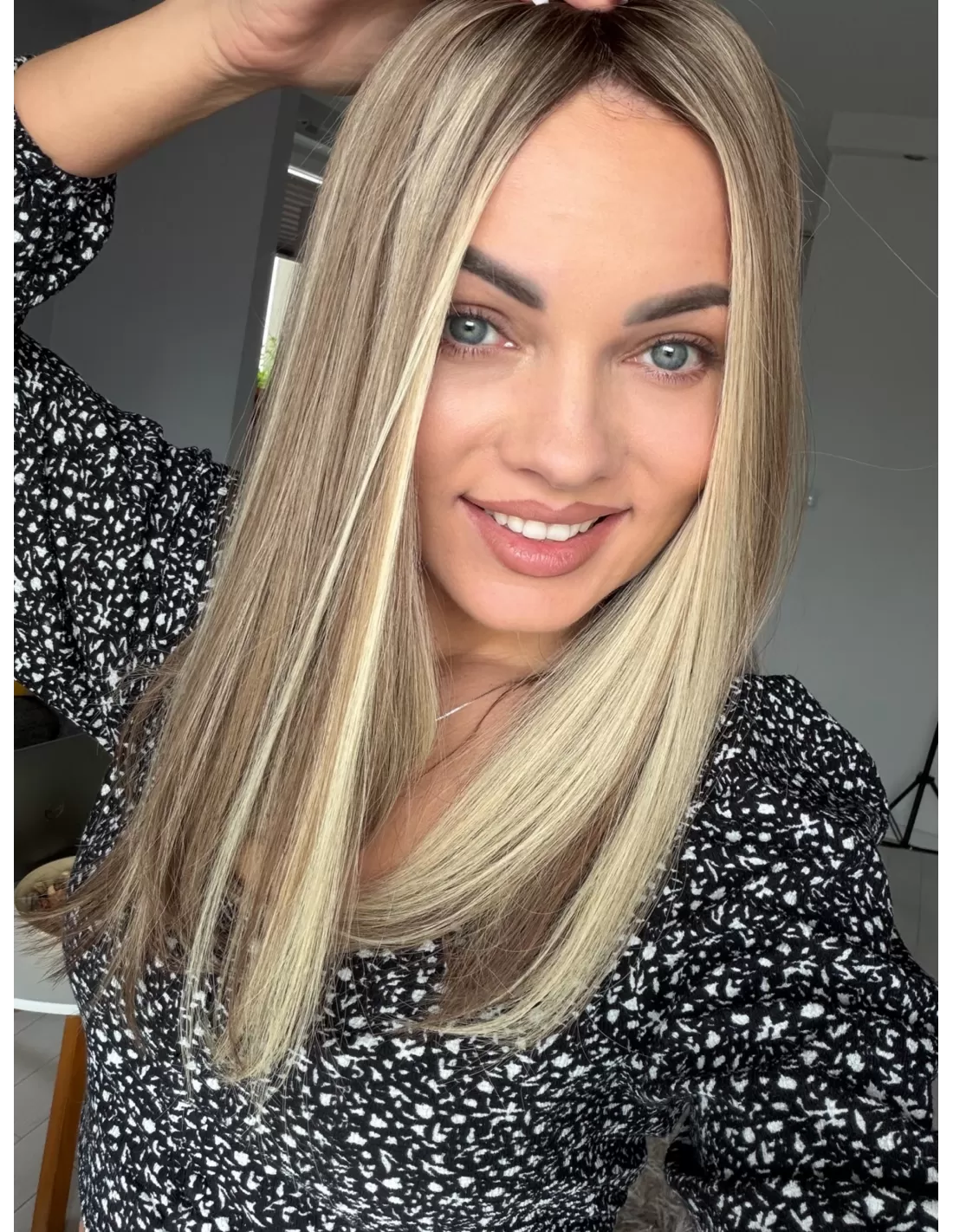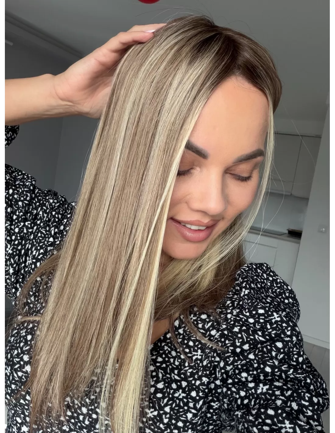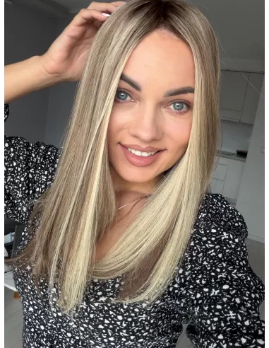 Daisy H14 to wielotonowy, neutralno-ciepły blond z naturalnym odrostem w odcieniu ciemnego blondu / jasnego brązu. Na długościach widoczna jest harmonijna mieszanka beżowych, miodowych i piaskowych tonów z delikatnymi jaśniejszymi refleksami, które nadają włosom miękkości oraz bardzo naturalnego, świetlistego efektu. Końce są subtelnie rozjaśnione — w odcieniu jasnego, kremowo-waniliowego blondu. Niejednolita koloryzacja sprawia, że topper doskonale stapia się z własnymi włosami i wygląda niezwykle naturalnie.