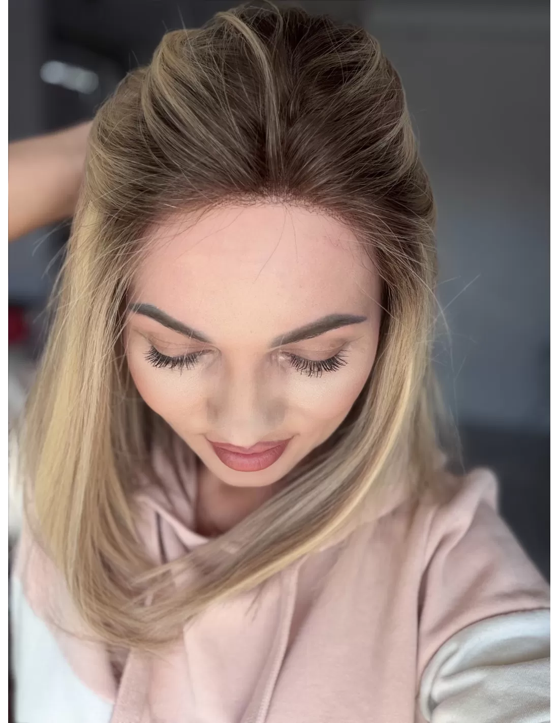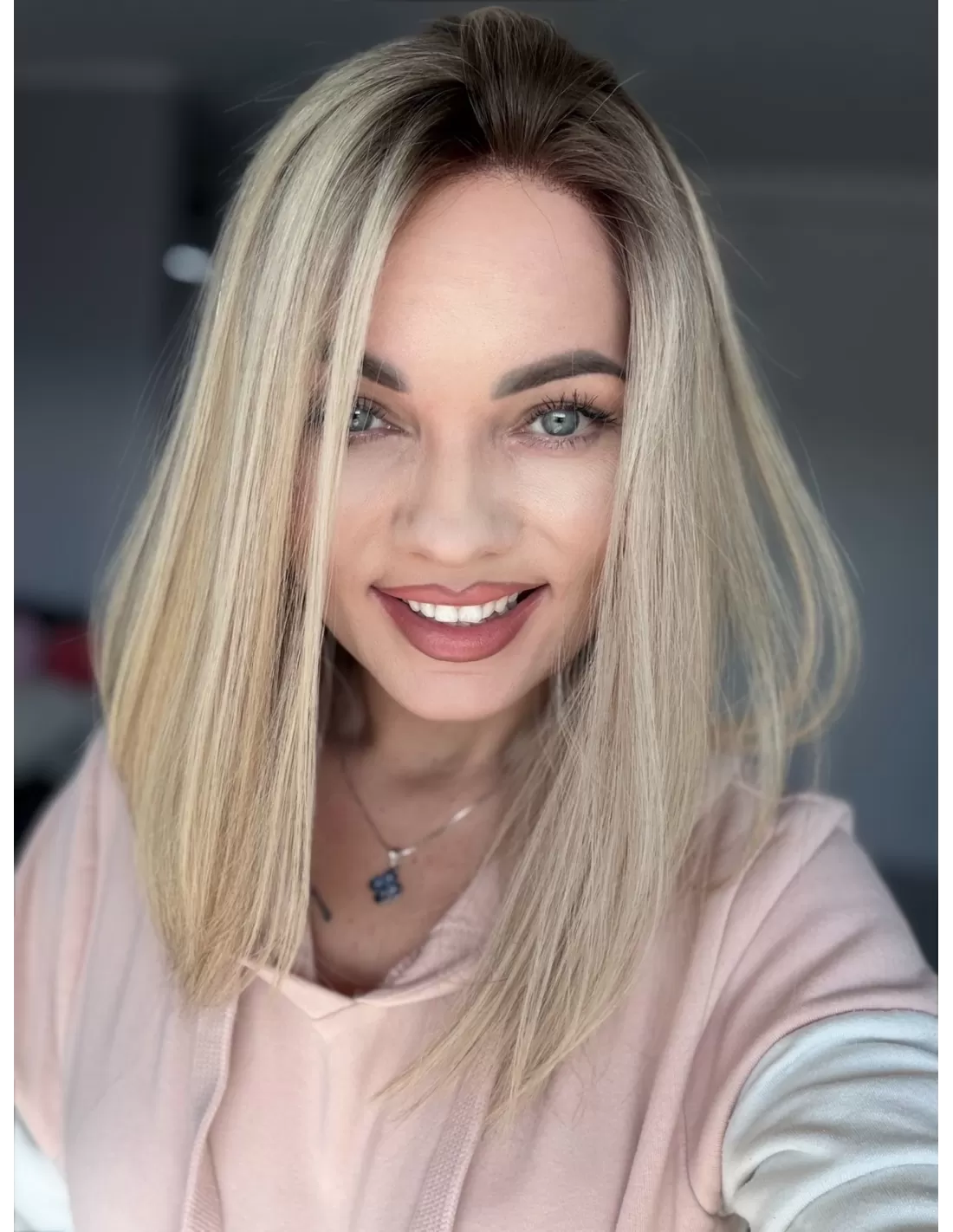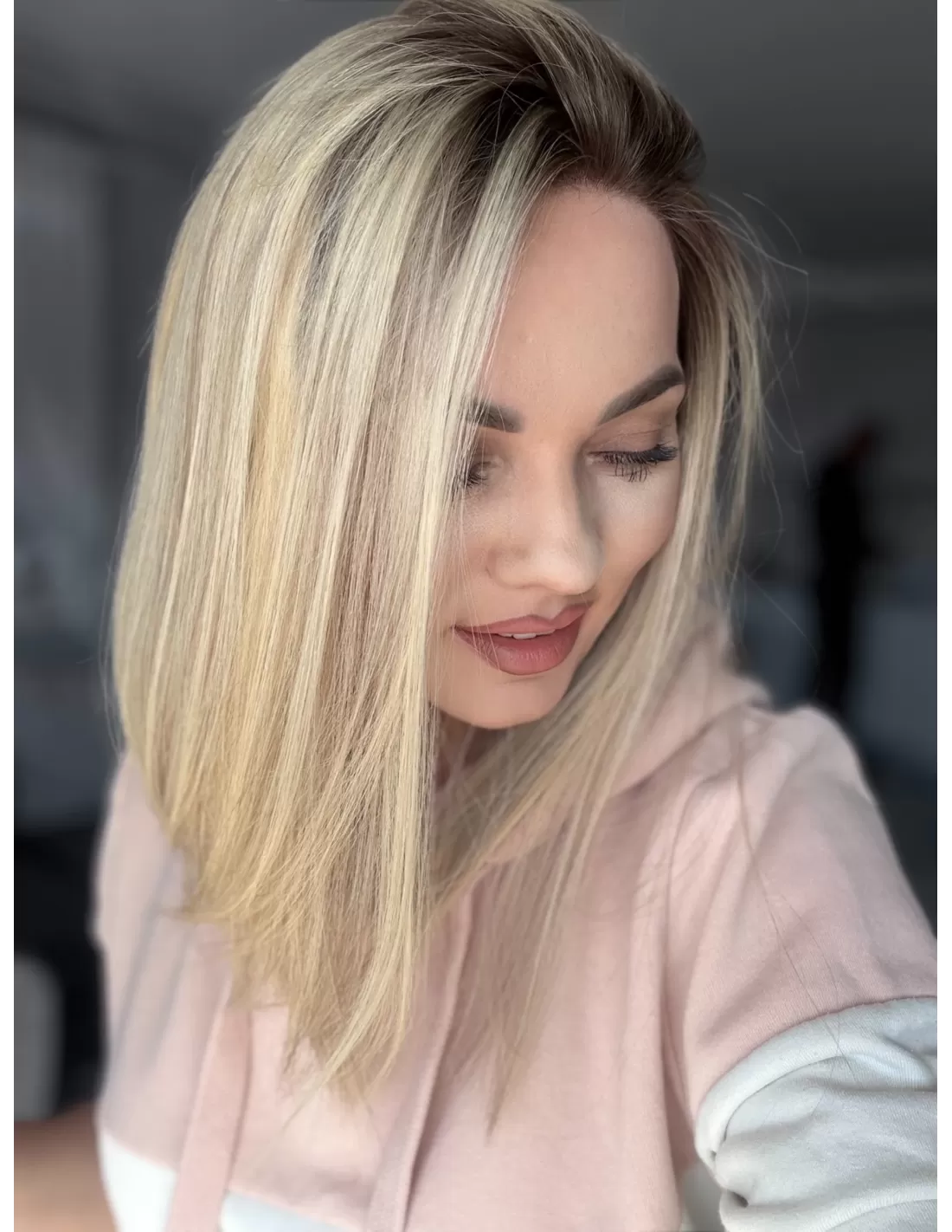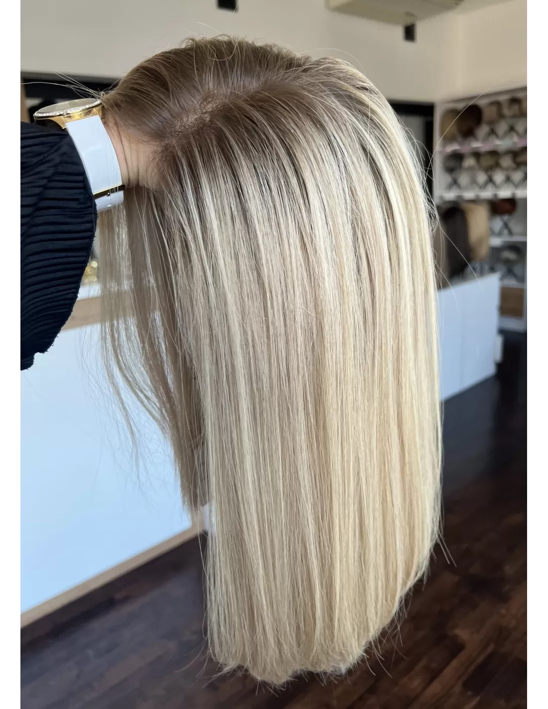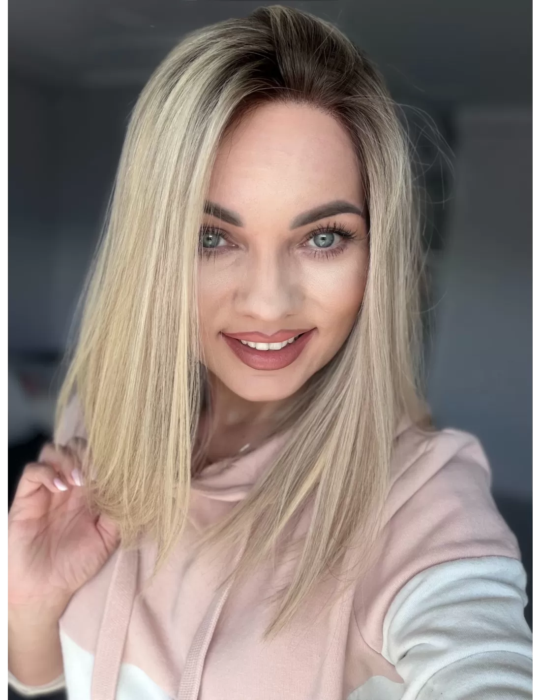 Ta wyjątkowa peruka z włosów naturalnych zachwyca perfekcyjnie dobranym stonowanym chłodnym odcieniu blondu. Delikatny odrost w odcieniu jasnego chłodnego brązu subtelnie podkreśla naturalność koloru, dodając mu autentycznego charakteru.