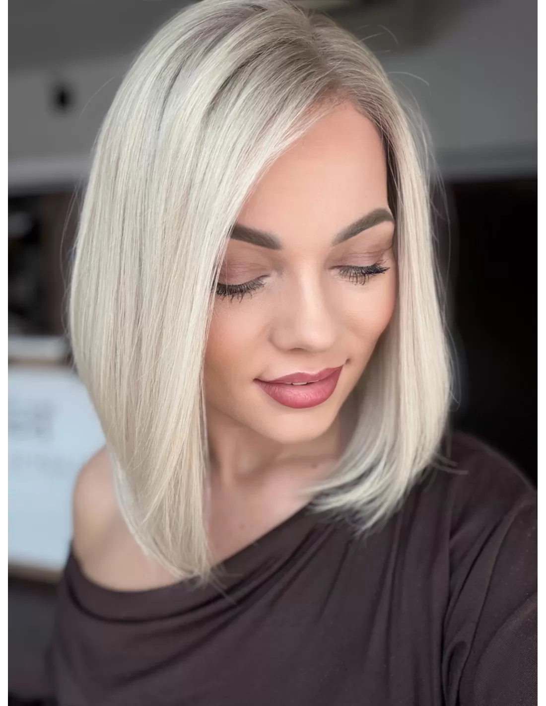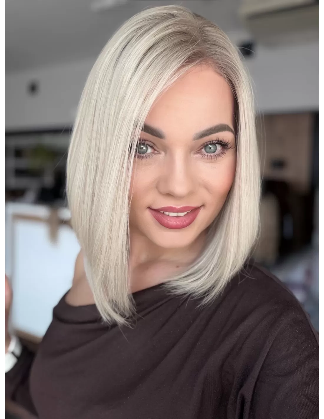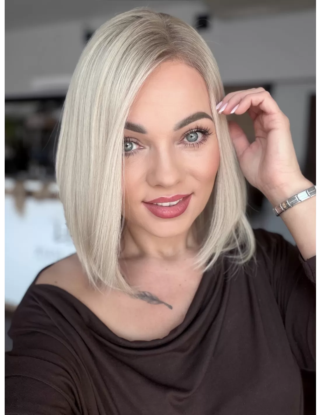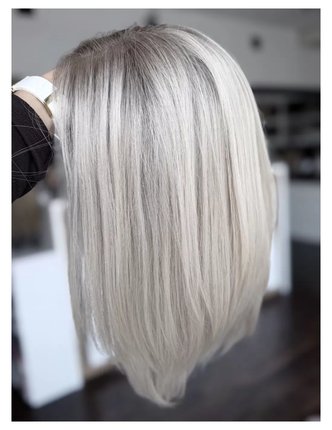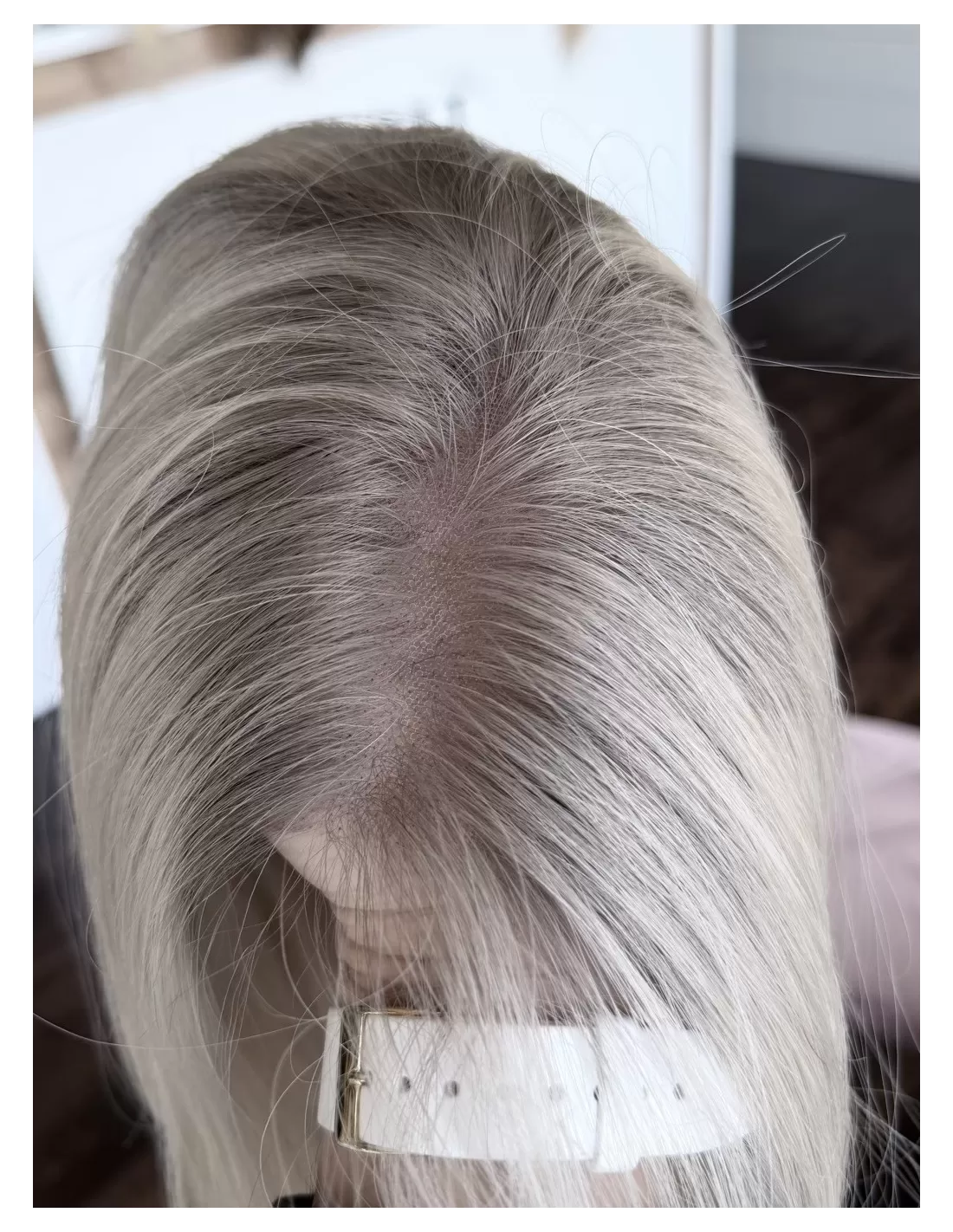 Ta wyjątkowa peruka z włosów naturalnych zachwyca perfekcyjnie dobranym stonowanym platynowym blondu. Delikatny odrost w odcieniu popielatego blondu subtelnie podkreśla naturalność koloru, dodając mu autentycznego charakteru.